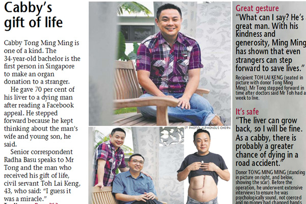 Mr Tong, a big, burly cabbieand a former cop, at once texted his old friend for more details. He eventually donated a part of his liver and now the patient, a former civil servant Toh Lai Keng, 43, from the Ministry of Home Affairs (MHA), lives on.
